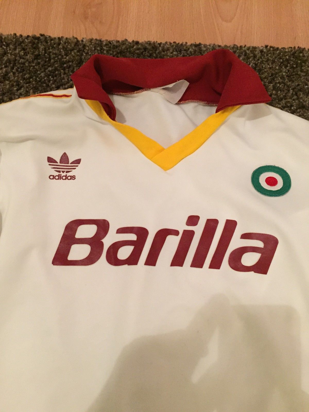 AS Roma 1991 adidas away shirt. In good condition for a 23 year old shirt with just a few bobbles and pulls. The label is washed out but measures 20 inches from pit to pit making it a size 40 inches.