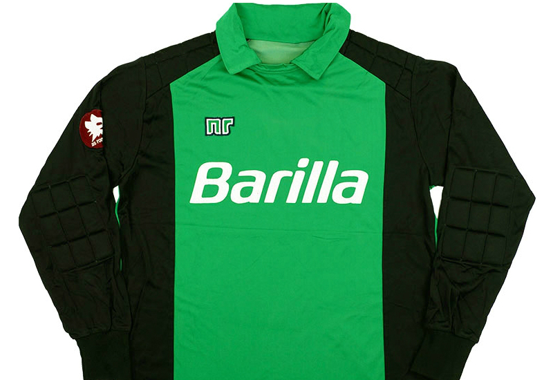 AS Roma 1987-88 player shirt by Ennerre believed to have been issued to or worn by #12 during the season the side finished 3rd in Serie A under boss Nils Leidholm. A young Angelo Peruzzi was the back up keeper behind Franco Tancredi, and would go on to enjoy a spectacularly successful career as Juventus and national team stopper.