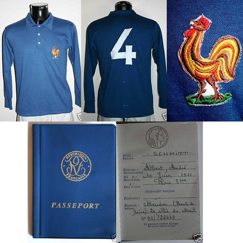 VINTAGE FRANCE MATCH WORN WARTIME PLAYER SHIRT 1942 RARE VINTAGE FRANCE WARTIME INTERNATIONAL MATCH WORN PLAYERS SHIRT V SWITZERLAND 1942 SHIRT NUMBER NO.4 ALBERT SCHMITT SHIRT SIZE L. BADGE EMBRIODERED AND THE NUMBER IS SEWN ON. THIS IS A REAL PEICE OF FOOTBALL HISTORY FROM OCCUPIED FRANCE, THIS IS A REALLY UNIQUE ITEM FOR YOUR COLLECTION. PURCHASED FROM FRANCE INTERNATIONALISTS COLLECTION AT KNIGHTS AUCTION FEBRUARY 2004 I ALSO PURCHASED ALBERT SCHMITTS PASSPORT WHEN I BOUGHT THIS SHIRT AND THIS IS INCLUDED IN THIS AUCTION, IMAGES HAVE NOW BEEN ADDED. ALL THE FEATURES YOU WOULD ASSOCIATE WITH A GENUINE PLAYER SHIRT.