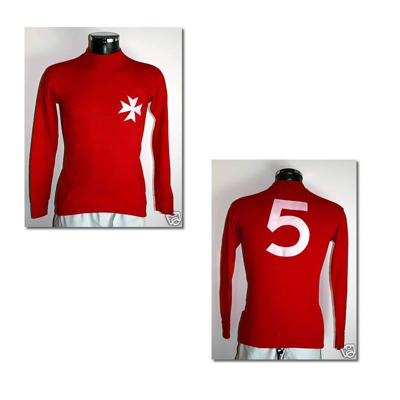 MALTA MATCH WORN PLAYER V ENGLAND 1971 DARMARIN MALTA MATCH WORN PLAYERS SHIRT V ENGLAND A THE EUROPEAN CHAMPIONSHIP QUALIFIER PLAYED ON 12TH MAY 1971 SPORTSMAN SHIRT NUMBER NO.5 EDDIE DARMARIN SHIRT SIZE L. SHIRT BADGE IS EMBRIODERED AND THE NUMBER IS SEWN ON. ENGLAND WON THIS TIE FIVE NIL ALL THE FEATURES YOU WOULD ASSOCIATE WITH A GENUINE PLAYER SHIRT.