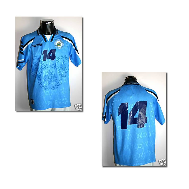 SAN MARINO MATCH WORN PLAYER SHIRT V SCOTLAND 2001 SAN MARINO MATCH WORN PLAYERS SHIRT FROM THE MATCH V SCOTLAND PLAYED AT HAMPDEN IN 2001 VIRMA SHIRT NUMBER NO.14 SHIRT SIZE XL. BADGE IS EMBRIODERED AND THE NUMBER IS IRONED ON VINYL. PURCHASED THIS SHIRT FROM THE STUART McMILLAN COLLECTION, WHICH WAS SOLD AT McTEARS AUCTION IN GLASGOW IN 2006. STUART McMILLAN WORKED WITH THE SCOTLAND SQUAD FOR MANY YEARS AND WAS KNOWN AFFECTIONATELY AS 'OMAR', HIS COLLECTION WAS MADE UP OF THE MANY SHIRTS THAT PLAYERS GAVE HIM OVER THE YEARS, BOTH PLAYER SWOP SHIRTS AND SCOTLAND SHIRTS ALL THE FEATURES YOU WOULD ASSOCIATE WITH A GENUINE PLAYER SHIRT.