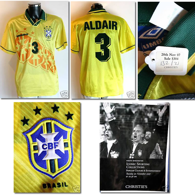BRAZIL ALDAIR MATCH WORN PLAYERS SHIRT OLYMPICS IN ATLANTA 1996 UMBRO SHIRT NO.3 ALDAIR SHIRT SIZE XL WORN IN THE ATLANTA OLYMPICS JULY 1996 BADGE IS FELT SEWN ON, AND THE PLAYER NUMBER IS IRONED ON FELT. PURCHASED THIS FROM THE MARIO ZAGOLO'S COLLECTION OF BRAZIL SHIRTS SOLD AT CHRISTIES IN 2007. WAS ABLE TO DETERMINE THAT THE SHIRT WAS FROM THIS TOURNAMENT, BUT UNABLE TO ASCERTAIN WHICH MATCH. CONDITION IS EXCELLENT ALL THE FEATURES YOU WOULD ASSOCIATE WITH A GENUINE PLAYER SHIRT.