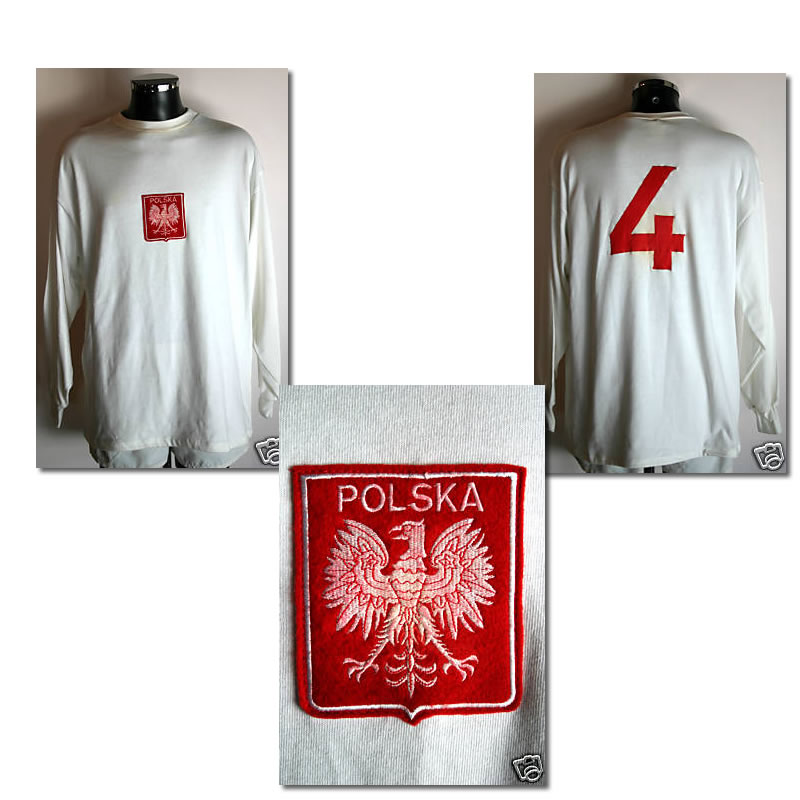 POLAND MATCH WORN PLAYERS SHIRT FROM THE MATCH V FRANCE ON 28TH SEPTEMBER 1960 SHIRT NO.4 MONICA SHIRT SIZE XL WAS A SWOP SHIRT WITH ONE OF THE FRENCH PLAYERS IN THE GAME BADGE IS VERY LARGE EMBRIODERED, AND THE PLAYER NUMBER IS SEWN ON. PURCHASED KNIGHTS AUCTIONS IN OCTOBER 2004 CONDITION IS EXCELLENT ALL THE FEATURES YOU WOULD ASSOCIATE WITH A GENUINE PLAYER SHIRT.