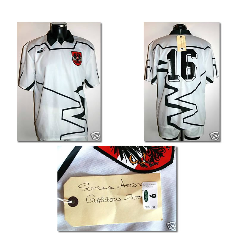 AUSTRIA MATCH WORN PLAYERS SHIRT FROM THE MATCH V SCOTLAND PLAYED AT HAMPDEN PARK IN 2000 PUMA SHIRT NUMBER NO.16 SHIRT SIZE XL BADGE IS SEWN ON VINYL AND THE PLAYER NUMBER IS IRONED ON VINYL PURCHASED THIS SHIRT FROM THE STUART McMILLAN COLLECTION, WHICH WAS SOLD AT McTEARS AUCTION IN GLASGOW IN 2006. STUART McMILLAN WORKED WITH THE SCOTLAND SQUAD FOR MANY YEARS AND WAS KNOWN AFFECTIONATELY AS 'OMAR', HIS COLLECTION WAS MADE UP OF THE MANY SHIRTS THAT PLAYERS GAVE HIM OVER THE YEARS, BOTH PLAYER SWOP SHIRTS AND SCOTLAND SHIRTS CONDITION IS EXCELLENT ALL THE FEATURES YOU WOULD ASSOCIATE WITH A GENUINE PLAYER SHIRT.