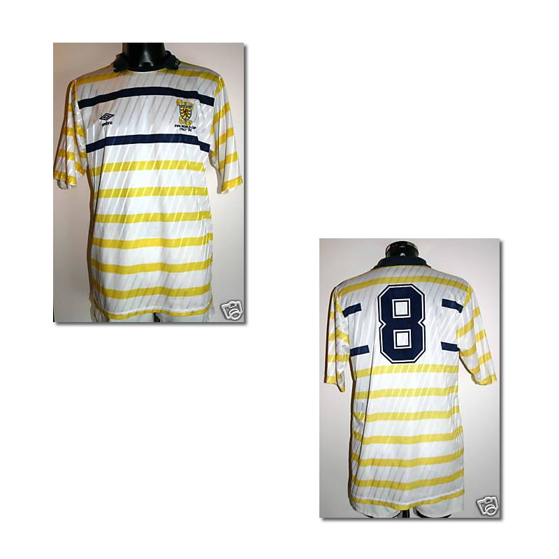 SCOTLAND MATCH WORN PLAYER SHIRT WORLD CUP 1990 BETT SCOTLAND MATCH WORN PLAYERS SHIRT FROM THE WORLD CUP GROUP MATCH V COST RICA IN ITALY 1990 UMBRO SHIRT NUMBER NO.8 JIM BETT SHIRT SIZE L SCOTLAND BADGE & WORLD CUP DETAILS ARE ALL EMBRIODERED, AND THE PLAYER NUMBER IS FELT IRONED ON CONDITION IS EXCELLENT ALL THE FEATURES YOU WOULD ASSOCIATE WITH A GENUINE PLAYER SHIRT.