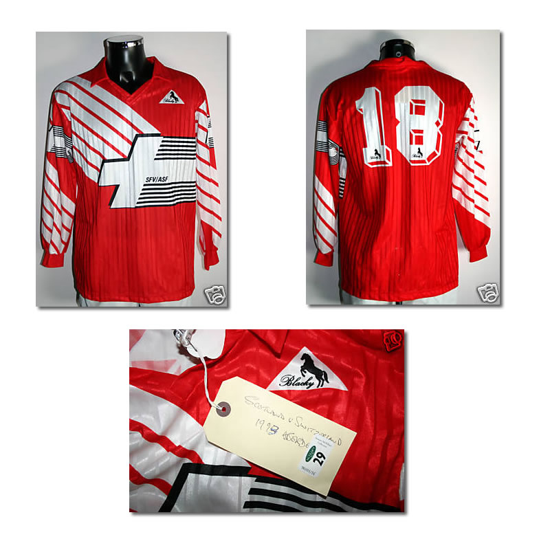 SWITZERLAND MATCH WORN PLAYERS SHIRT FROM THE MATCH V SCOTLAND PLAYED AT PITTODRIE, ABERDEEN IN 1993. BLACKY SHIRT NUMBER NO.18 SHIRT SIZE XL. UNUSUAL SHIRT DESIGN AND RARE MAKER. PLAYERS NUMBER & SWITZERLAND LOGO ARE ALL INTEGRAL TO SHIRTS PRINT PURCHASED THIS SHIRT FROM THE STUART McMILLAN COLLECTION, WHICH WAS SOLD AT McTEARS AUCTION IN GLASGOW IN 2006. STUART McMILLAN WORKED WITH THE SCOTLAND SQUAD FOR MANY YEARS AND WAS KNOWN AFFECTIONATELY AS 'OMAR', HIS COLLECTION WAS MADE UP OF THE MANY SHIRTS THAT PLAYERS GAVE HIM OVER THE YEARS, BOTH PLAYER SWOP SHIRTS AND SCOTLAND SHIRTS ALL THE FEATURES YOU WOULD ASSOCIATE WITH A GENUINE PLAYER SHIRT.