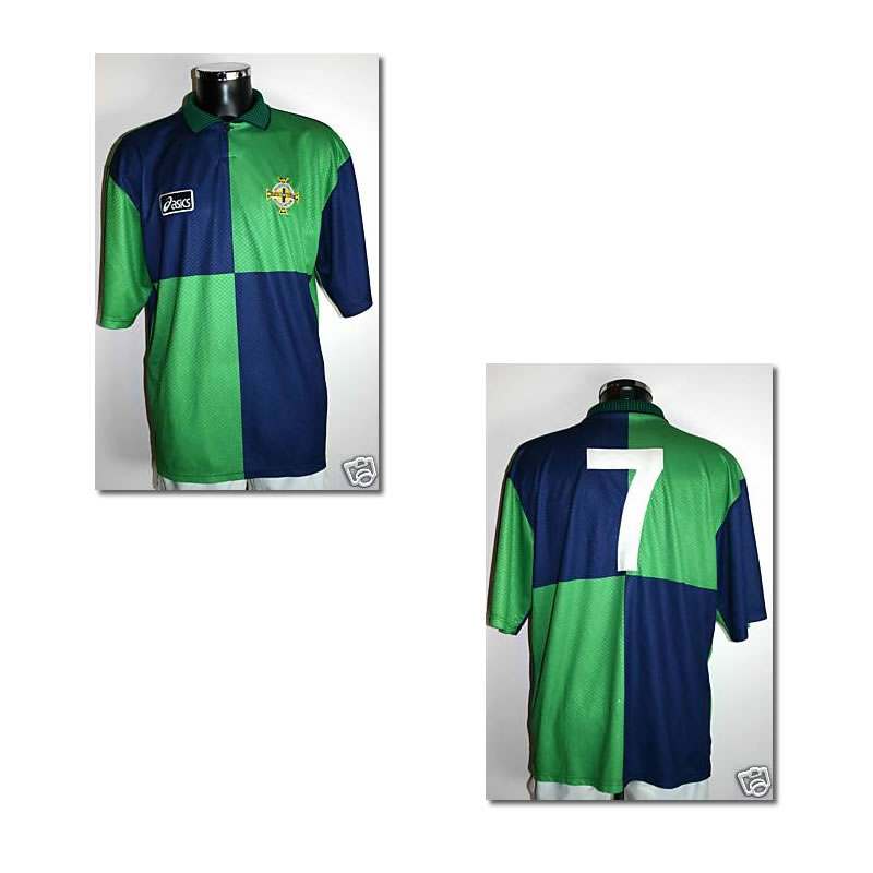 NORTHERN IRELAND MATCH WORN PLAYERS SHIRT FROM THE LATE 90'S. ASICS SHIRT NUMBER NO.7 SHIRT SIZE XL. BADGE IS EMBRIODERED AND THE NUMBER IS SEWN ON. ALL THE FEATURES YOU WOULD ASSOCIATE WITH A GENUINE PLAYER SHIRT.