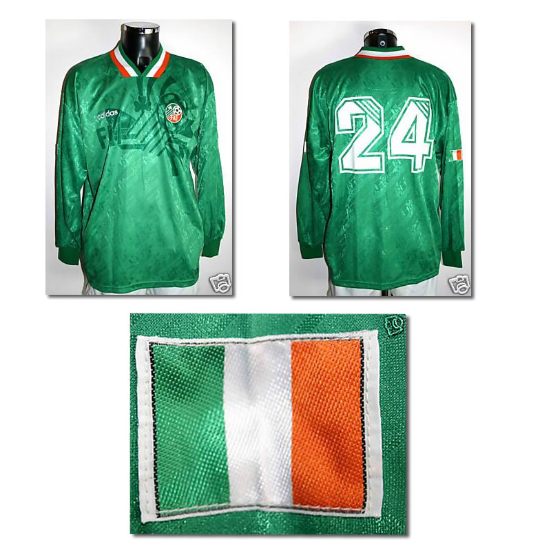 REPUBLIC OF IRELAND MATCH WORN PLAYER SHIRT 1993 / 1994 REPUBLIC OF IRELAND MATCH WORN PLAYERS SHIRT FROM 1993 / 1994 ADIDAS SHIRT NUMBER NO.24 SHIRT SIZE XL. BADGE IS EMBRIODERED AND THE NUMBER IS FELT IRONED ON. IRISH TRI-COLOUR BADGE SEWN ON BOTH ARMS ALL THE FEATURES YOU WOULD ASSOCIATE WITH A GENUINE PLAYER SHIRT.
