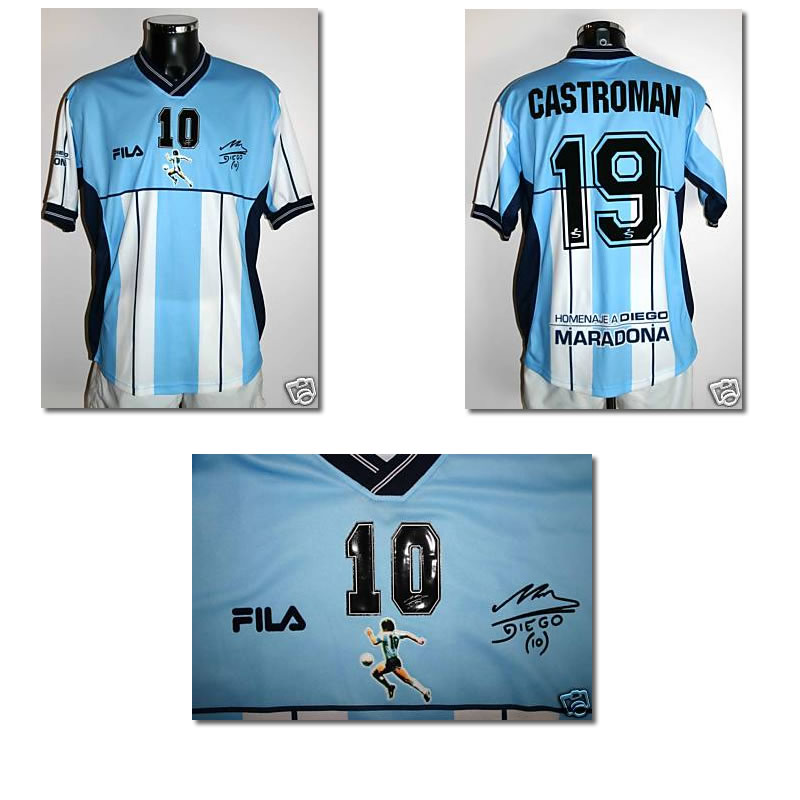 RARE ARGENTINA INTERNATIONAL MATCH WORN PLAYERS SHIRT WORN FOR MARADONA'S FAREWELL GAME ON 11TH NOVEMBER 2001 VERSUS A REST OF THE WORLD SELECT FILA NUMBER NO.19 CASTROMAN SHIRT SIZE L. NAME AND NUMBER OS IRONED ON FELT. SHIRT WAS PURCHASED FROM GMMI GROUP OF ARGENTINA ALL THE FEATURES YOU WOULD ASSOCIATE WITH A GENUINE PLAYER SHIRT.