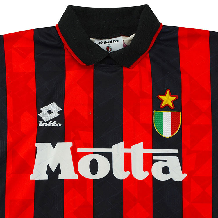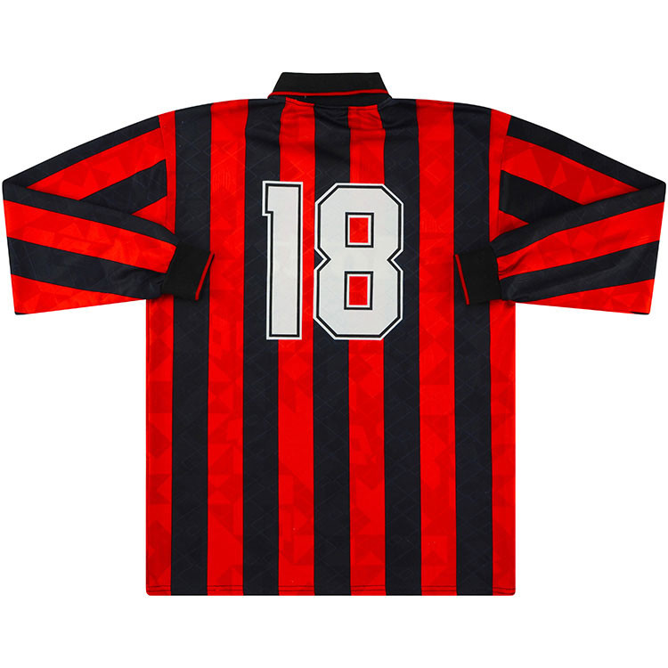 AC Milan 1993-94 player shirt by Lotto believed to have been issued to or worn by a #18 when I Rossoneri won a Serie A and Champions League double under coach Fabio Capello.