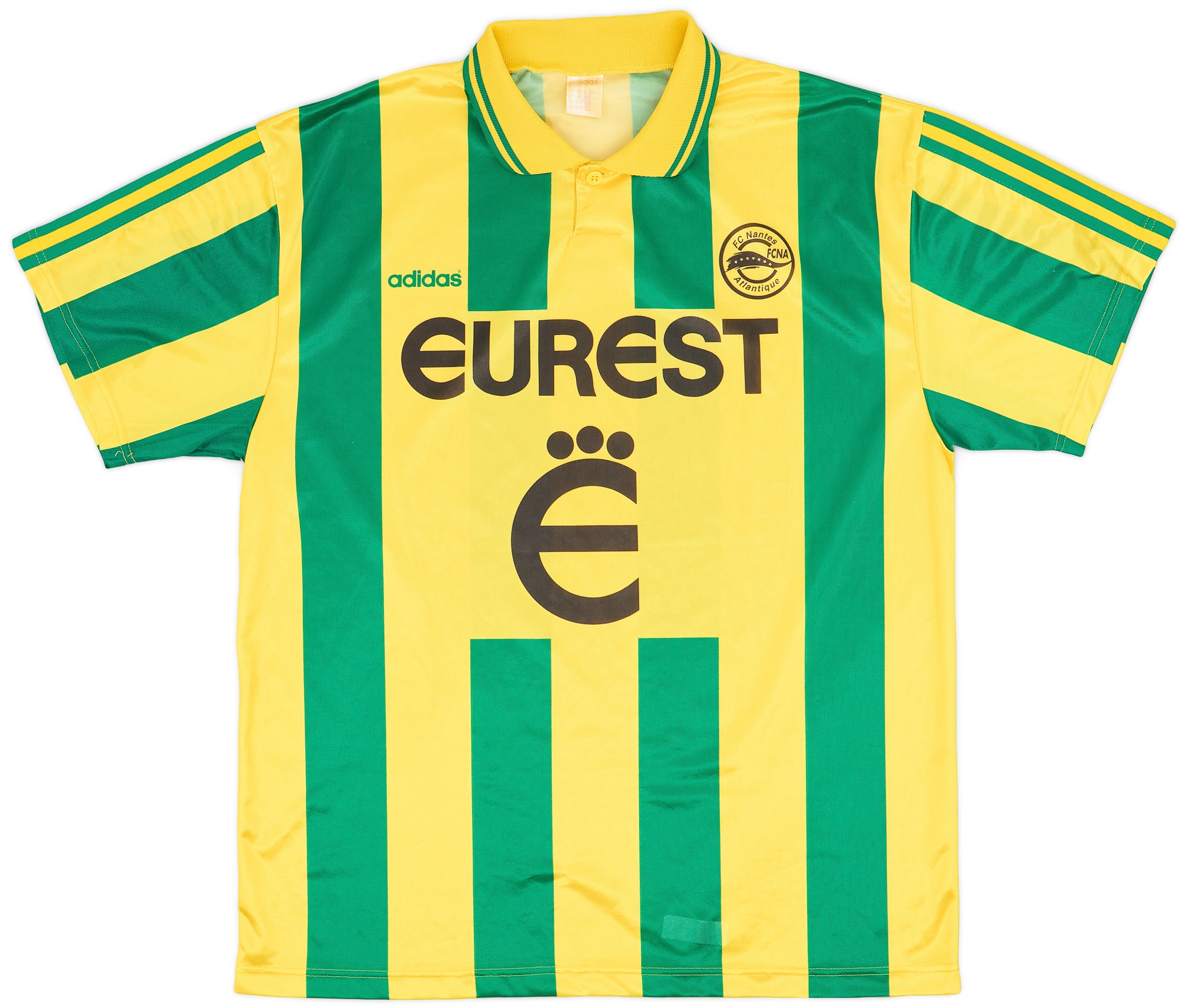 The 1995–96 FC Nantes home shirt by adidas was worn during a memorable campaign when the French side reached the UEFA Champions League semi-finals, narrowly losing to eventual winners Juventus.