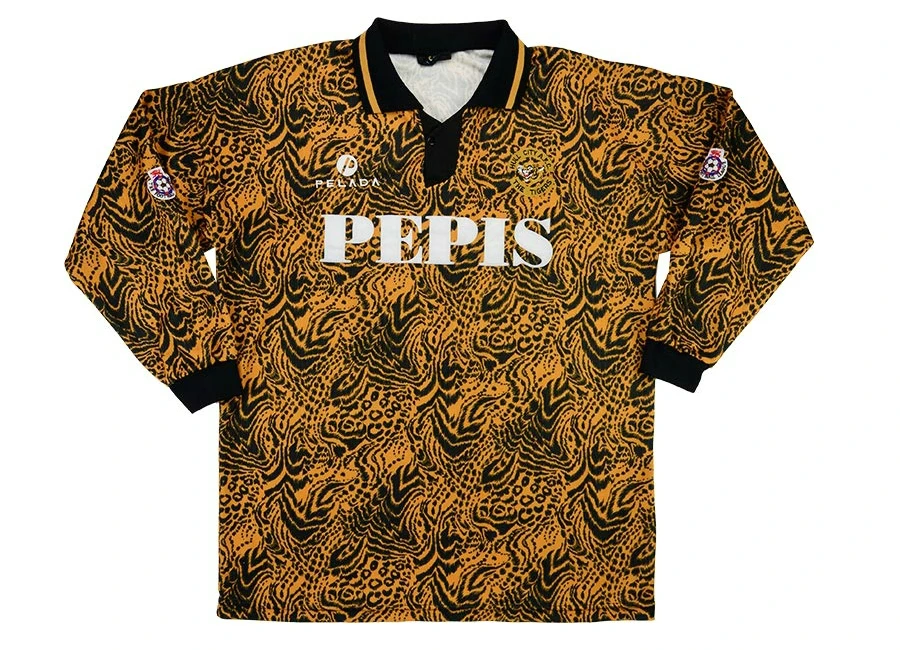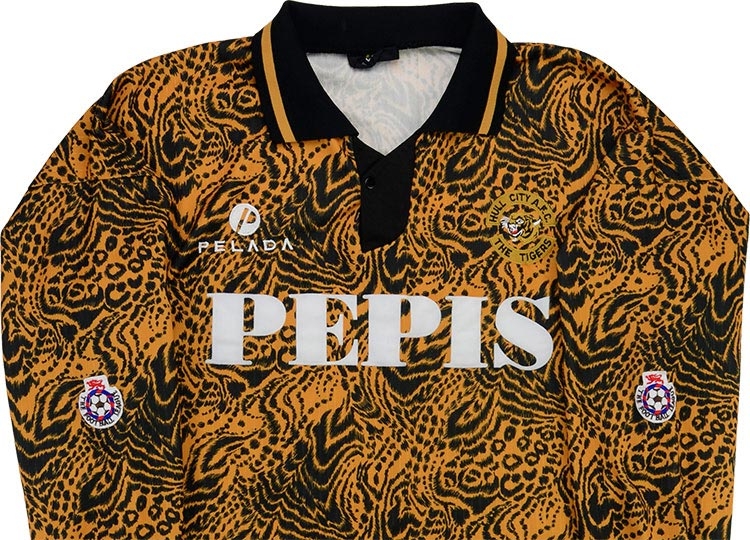 Notably this design features in many polls of the best and worst football shirts of all time, with the long-sleeved version a superb example of the iconic tiger print. Correct player size printing professionally heat pressed, official Football League sleeve patches professionally machine embroidered, embroidered club badge, long-sleeved design never commercially available.