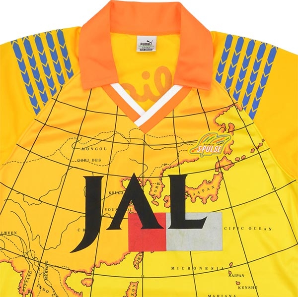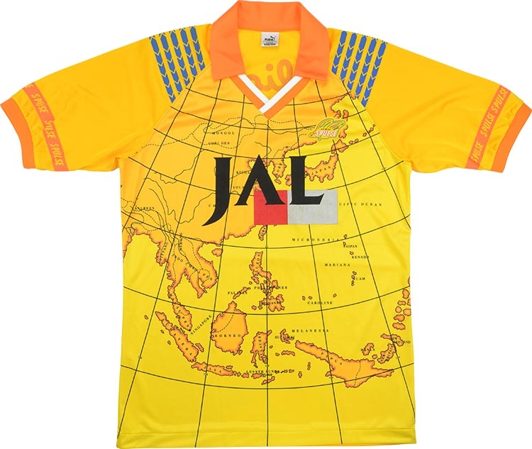 Shimizu S-Pulse 1992 home shirt by Puma with great design incorporating a map of East Asia as worn when the side reached the Final of the J. League Cup in the year before the league began.