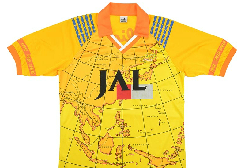 Shimizu S-Pulse 1992 home shirt by Puma with great design incorporating a map of East Asia as worn when the side reached the Final of the J. League Cup in the year before the league began.