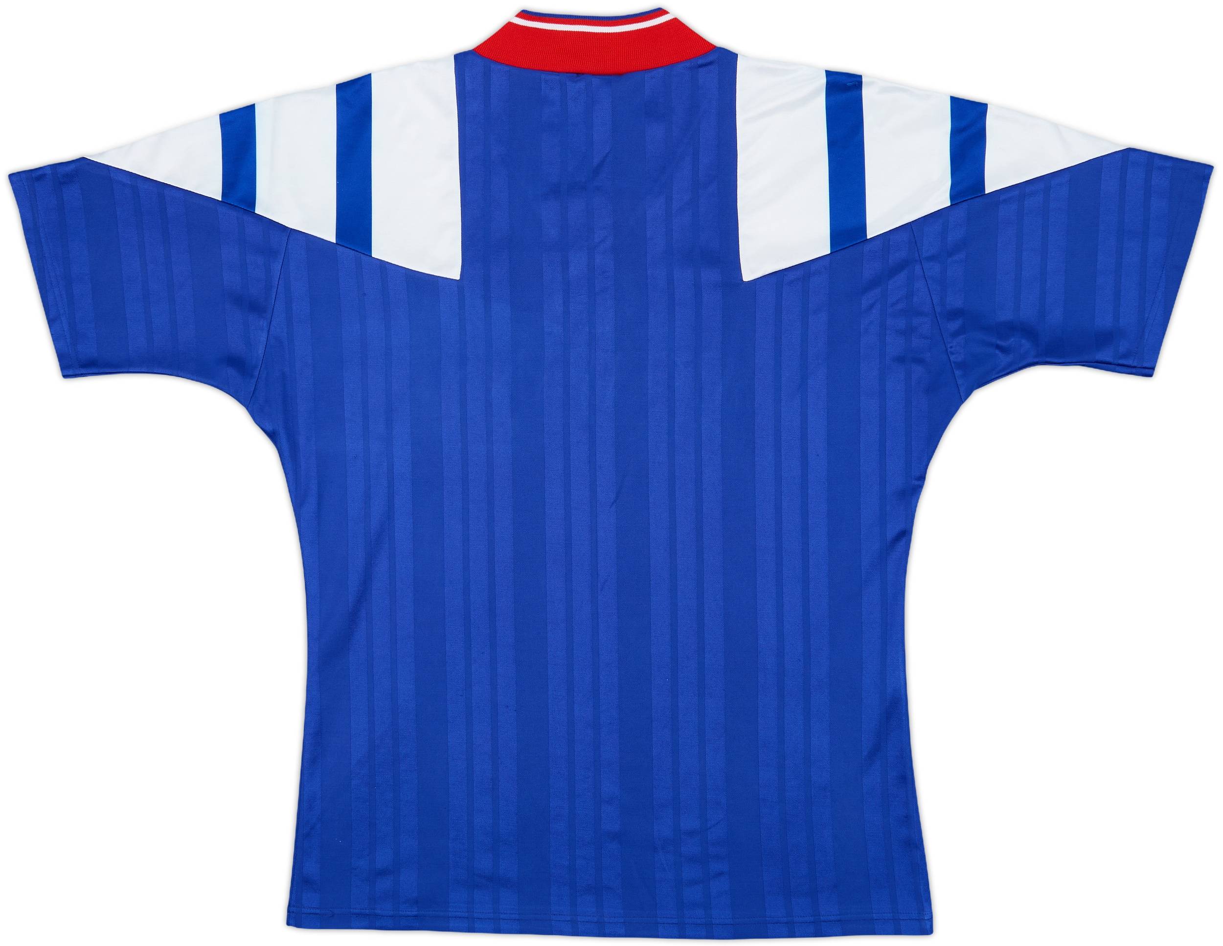 The Rangers home shirt from 1992 to 1994 was manufactured by adidas and sponsored by McEwan’s Lager. This design was worn as the club continued their domestic dominance under Walter Smith, winning consecutive Scottish Premier Division titles.