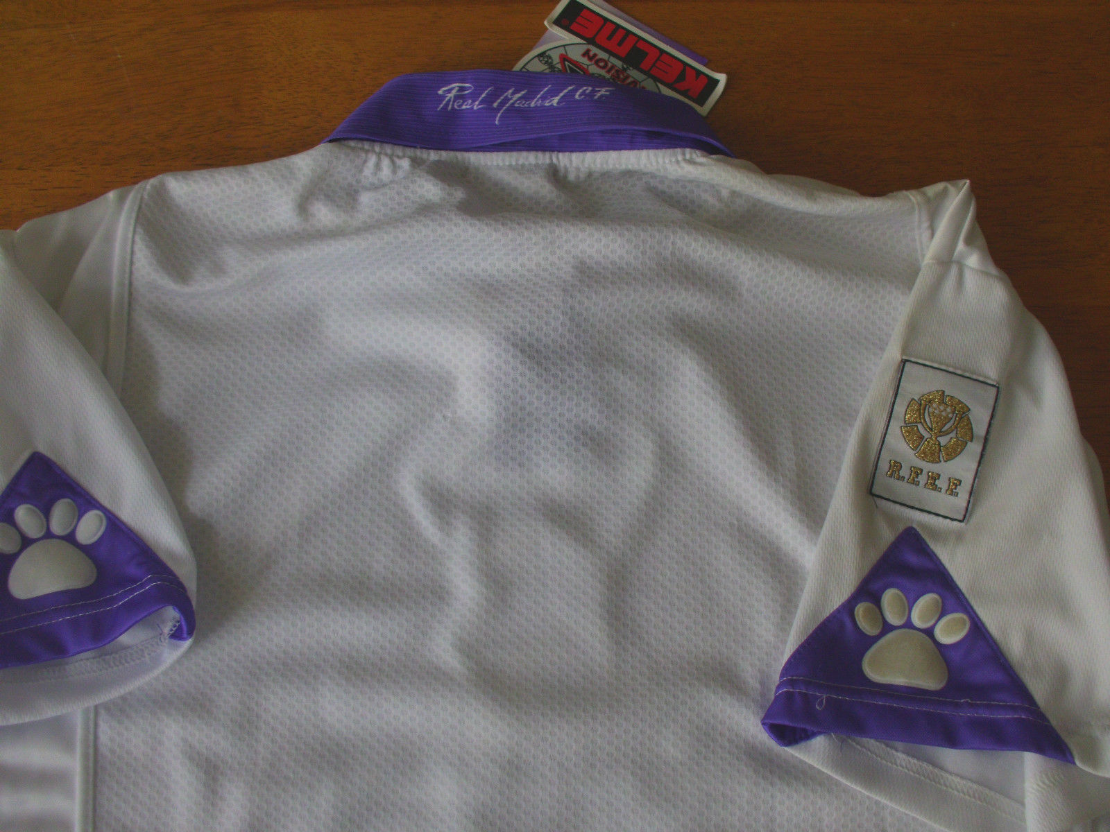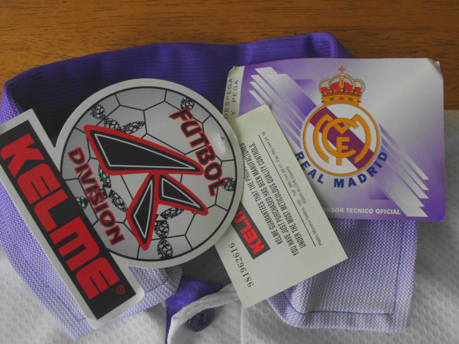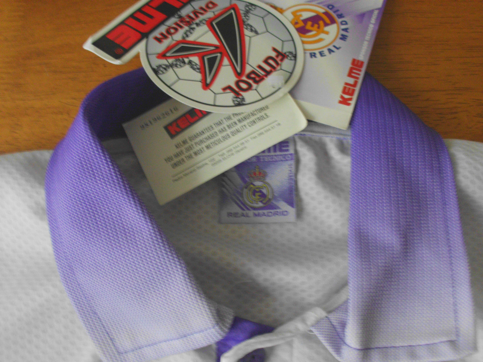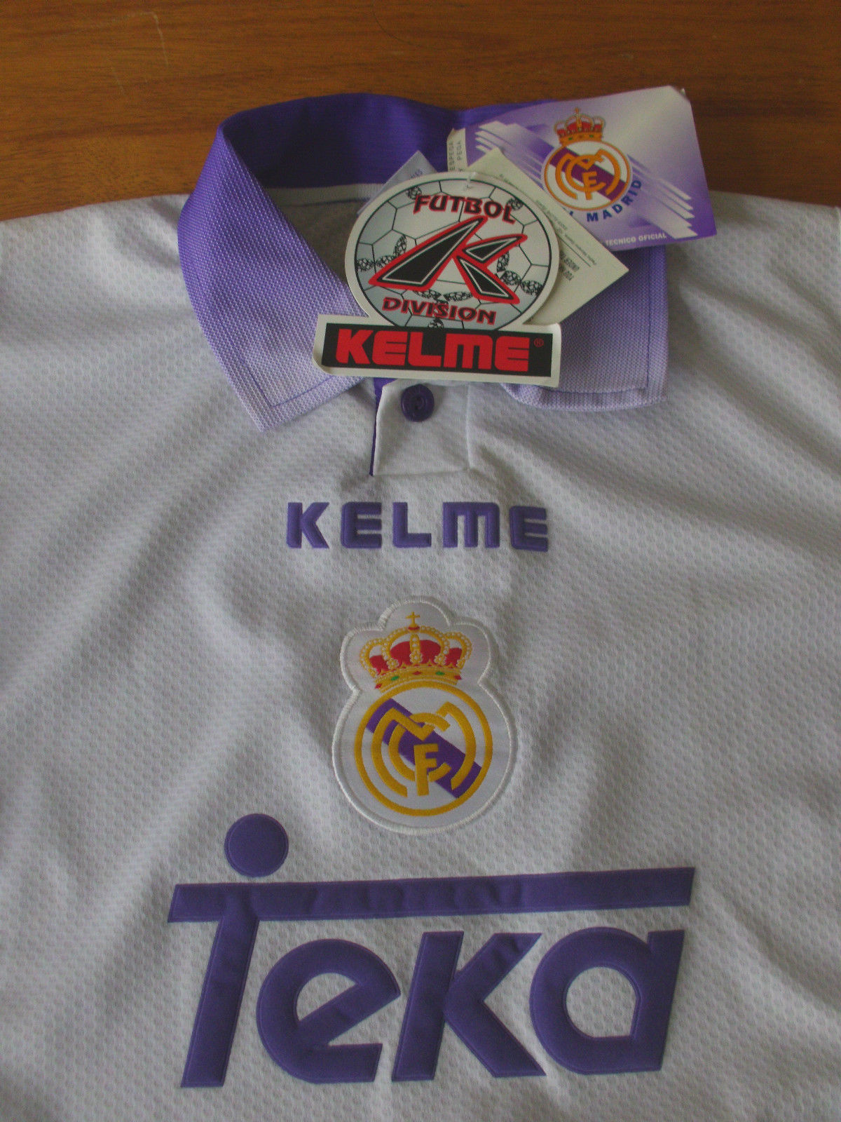 Real Madrid Kelme home shirt from 1997. Brand new with Kelme tags still attached, size large, RF.E.F patch on arm. This has been stuck on a shelf in a storeroom for years, there are a few faint age marks on shoulder, but it just needs a wash, front and back of shirt is perfect.