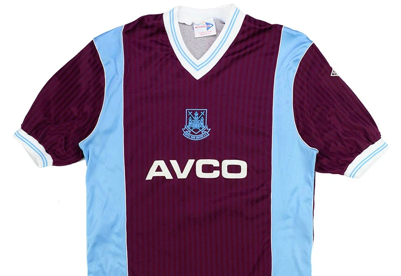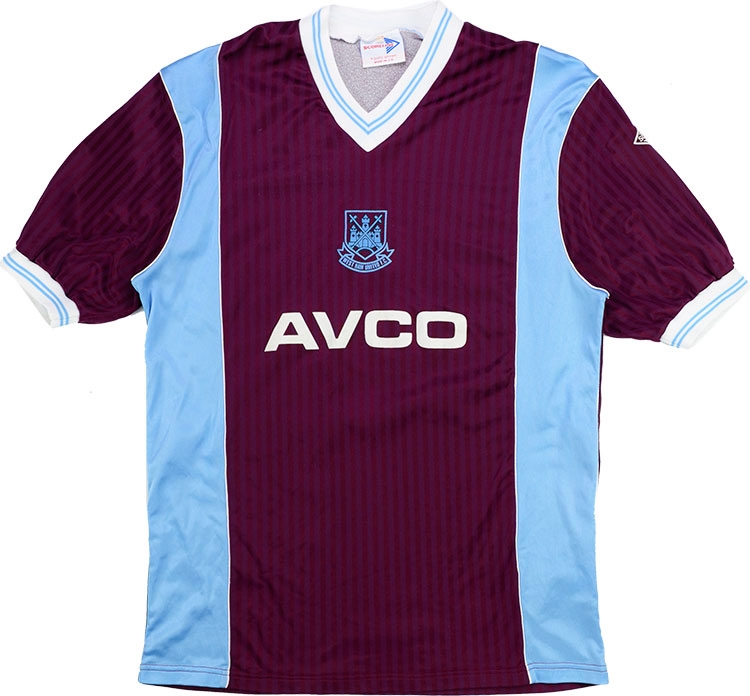 West Ham United 1987-89 home shirt by Scoreline with classic Avco sponsor as worn when the side struggled in the First Division, finishing 16th and then suffering relegation in '89 in John Lyall's last term in charge after a 15 year reign.
