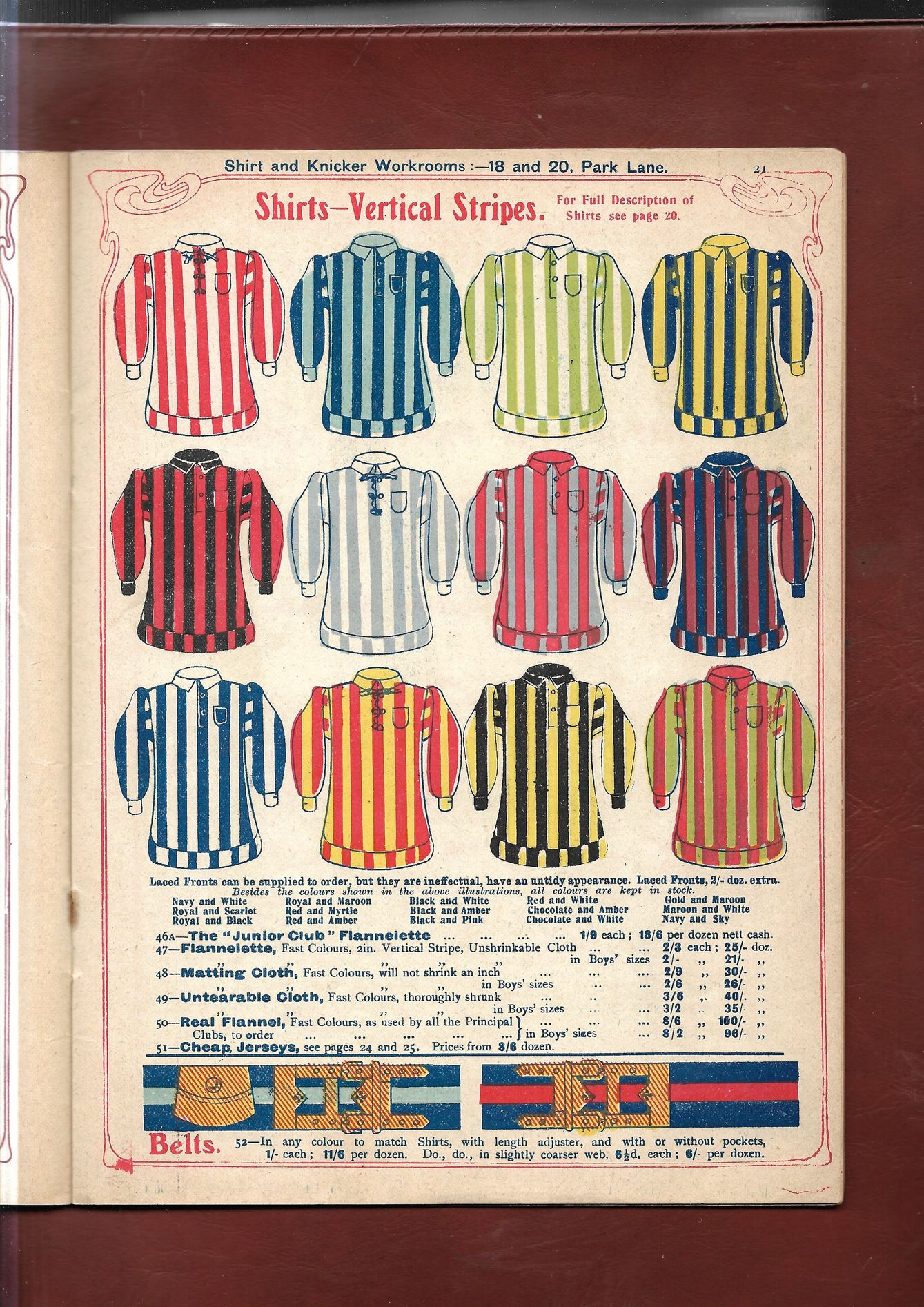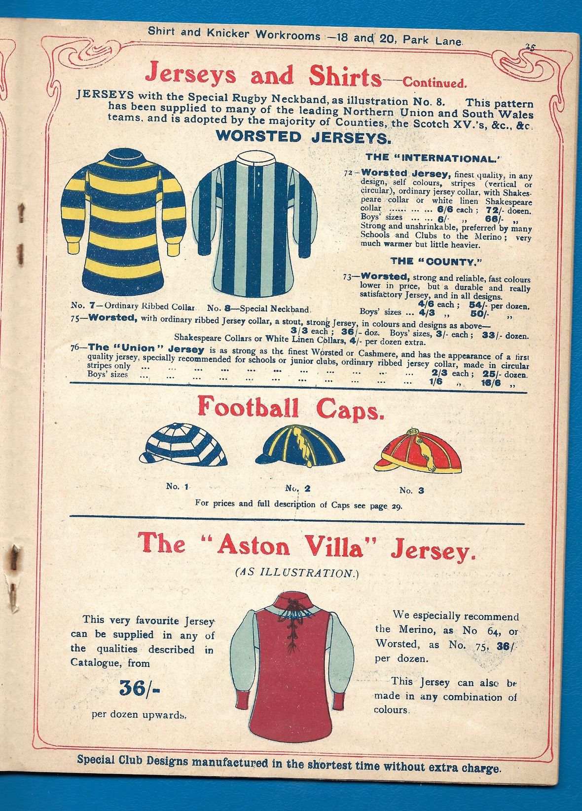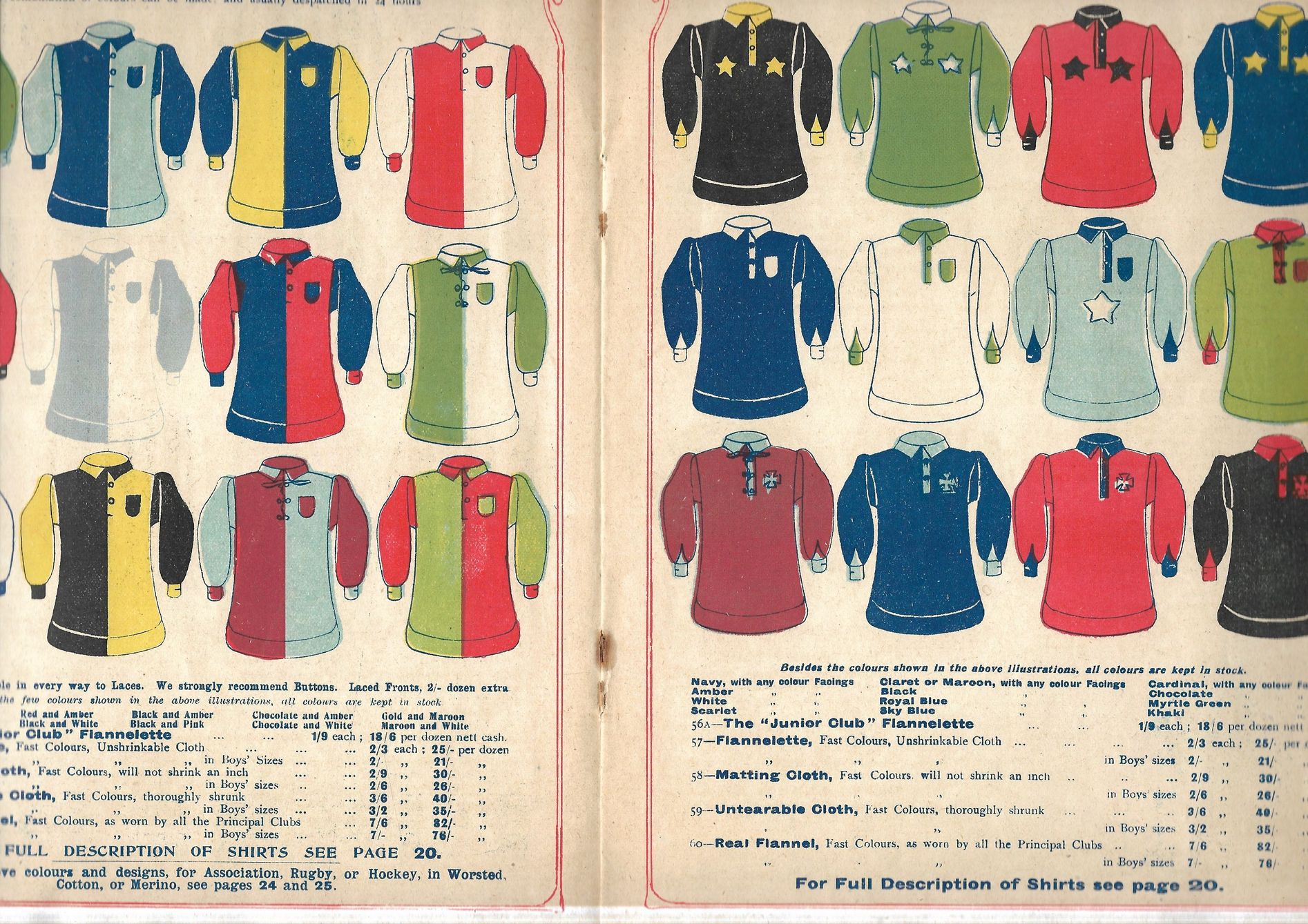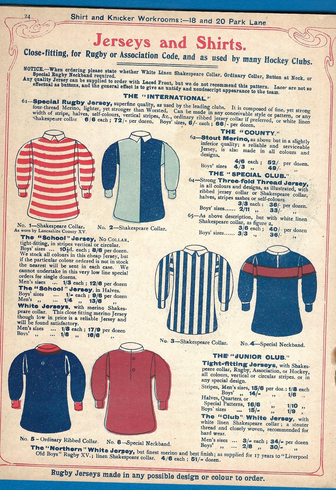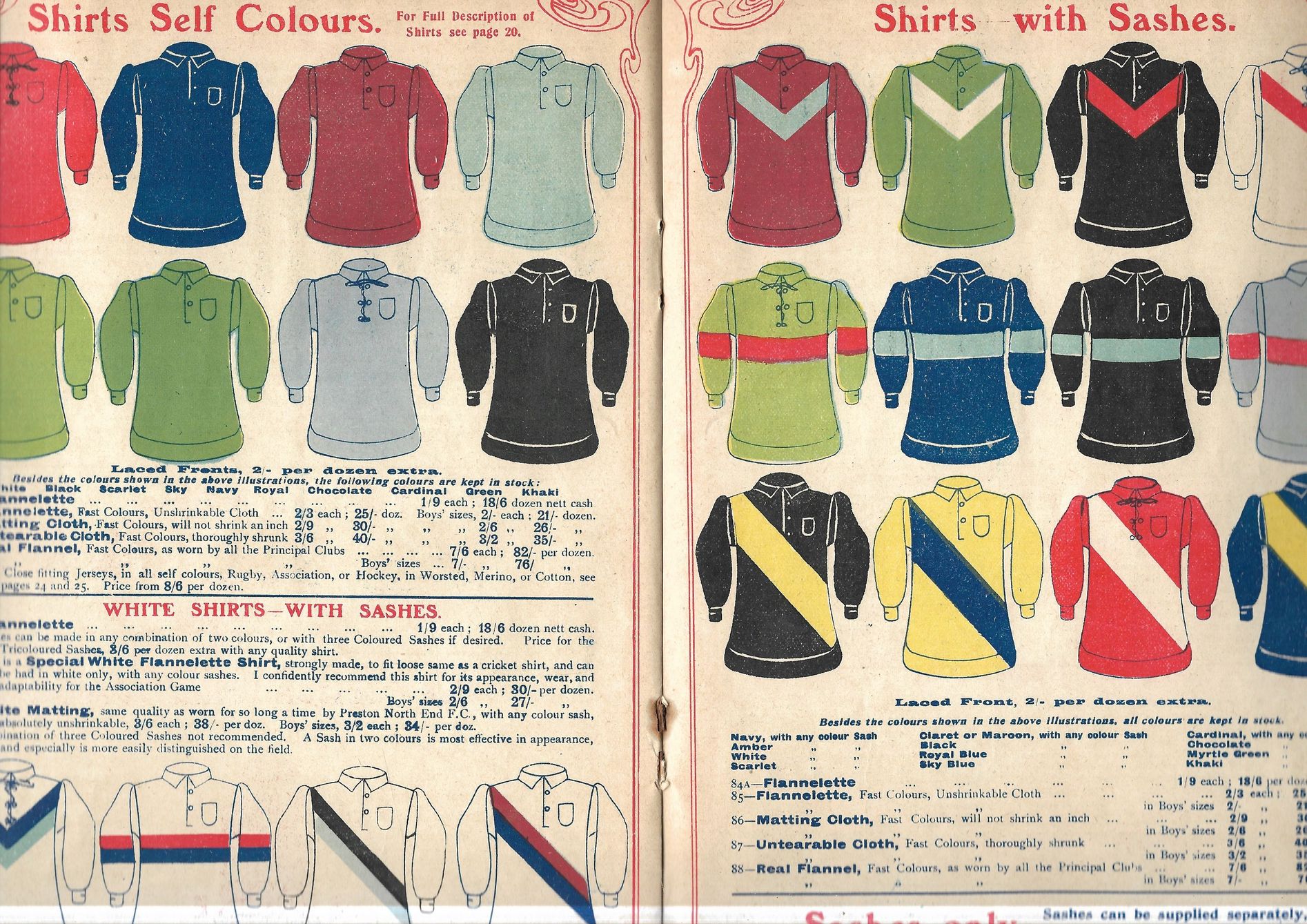 The Frank Sugg brochure features striking shirts in wonderful fabrics such as merino and flannelette, with countless combination options on designs, cuts and necks - button and lace-up, of course, and “Shakespeare” collars. If anything, it could be said that - sublimation of graphics aside - a truly bespoke kit was easier to come by 117 years ago than it is today!