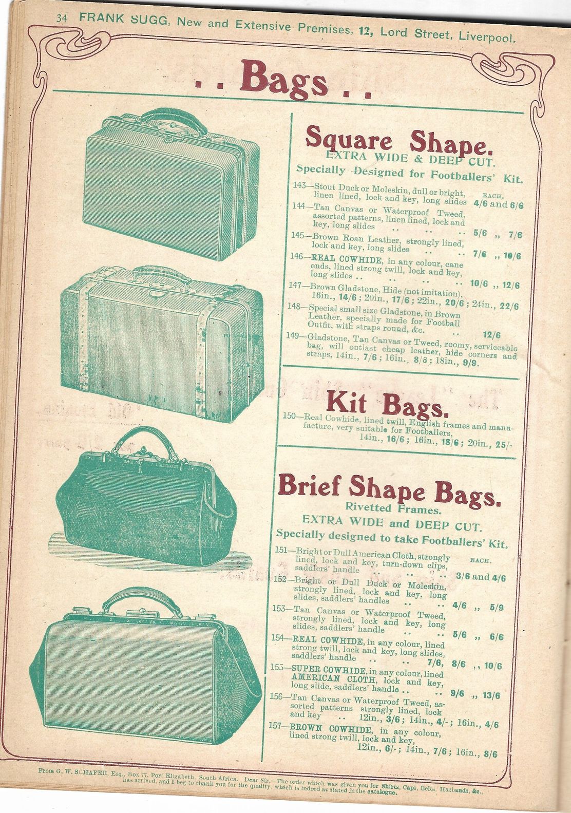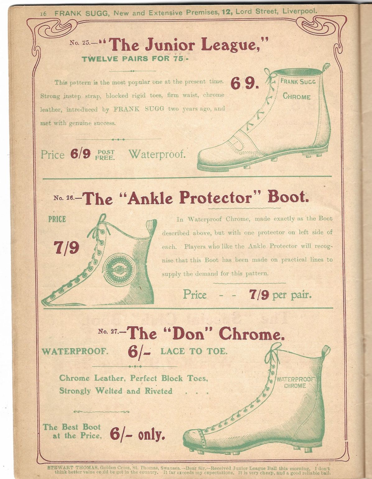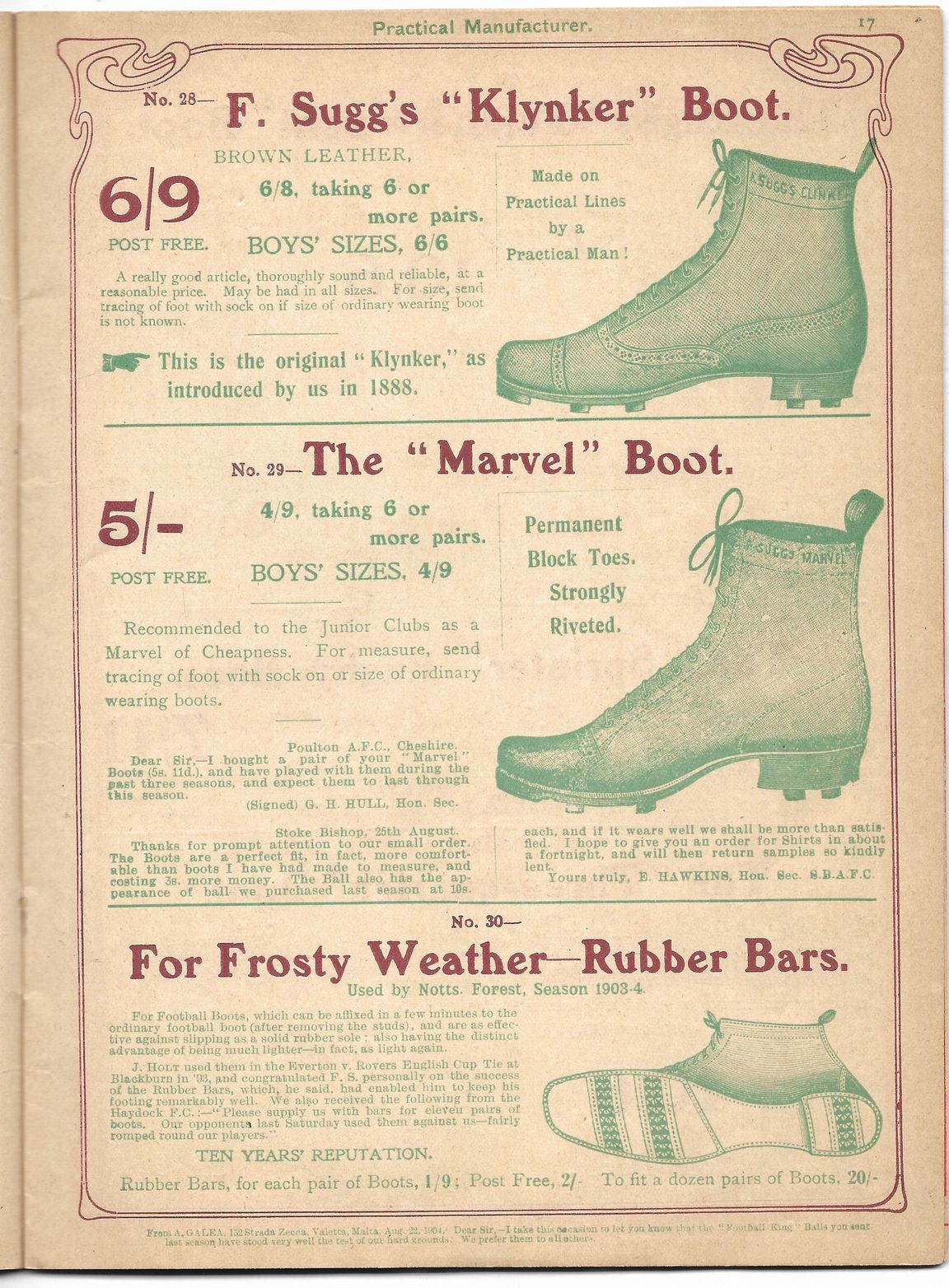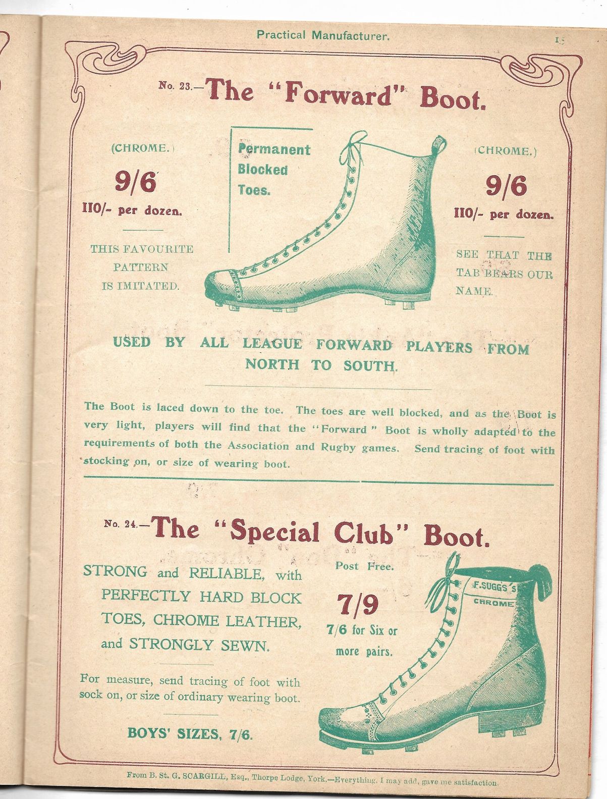 And a footballer - of “Rugby or Association Code” - also needs boots, which Frank Sugg will gladly supply. A “Forward” boot, perhaps? Or the brogue-style “Klynker”? Suit you.