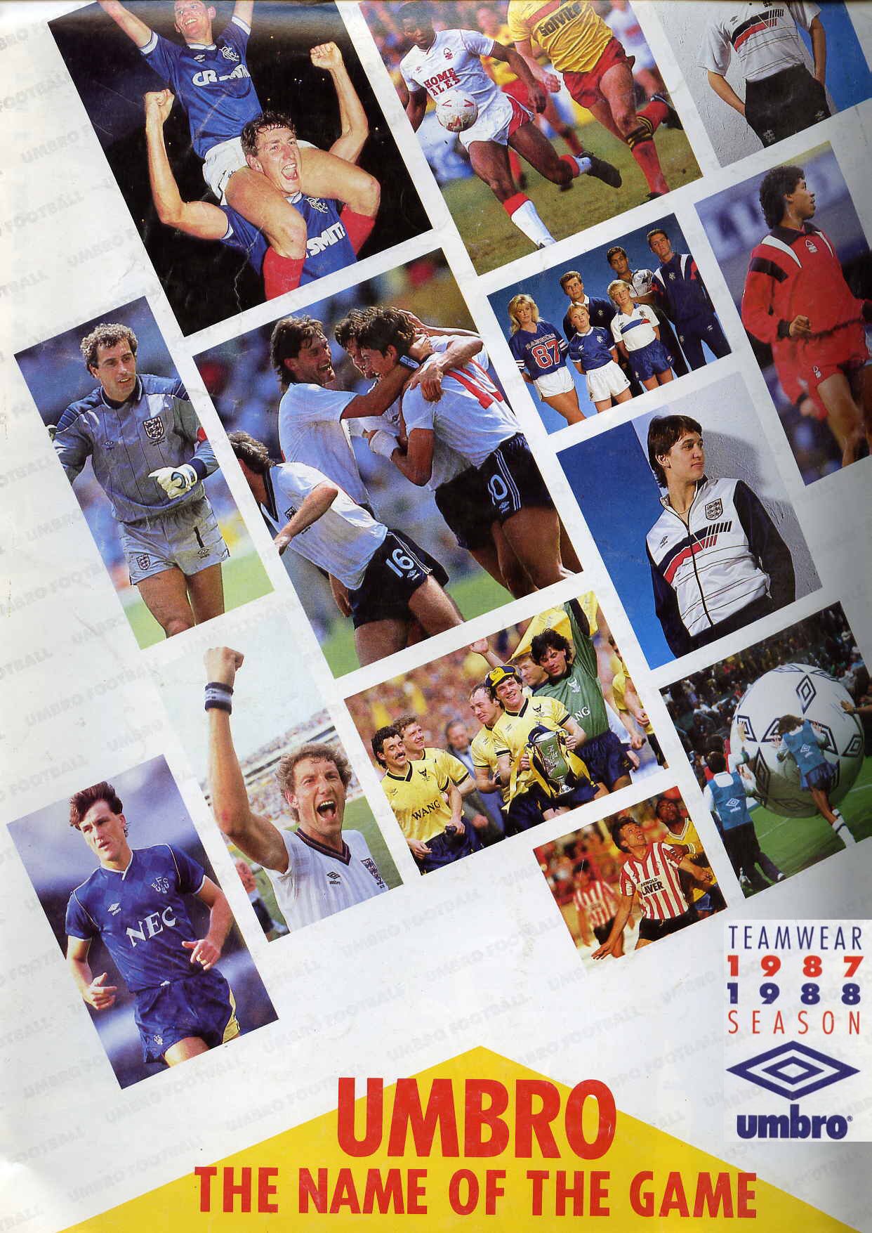 Amongst several references to England’s topsy-turvy showing in the previous year’s World Cup, this 1987-88 teamwear showcase also features a mismatched outfield Everton mashup on the cover.