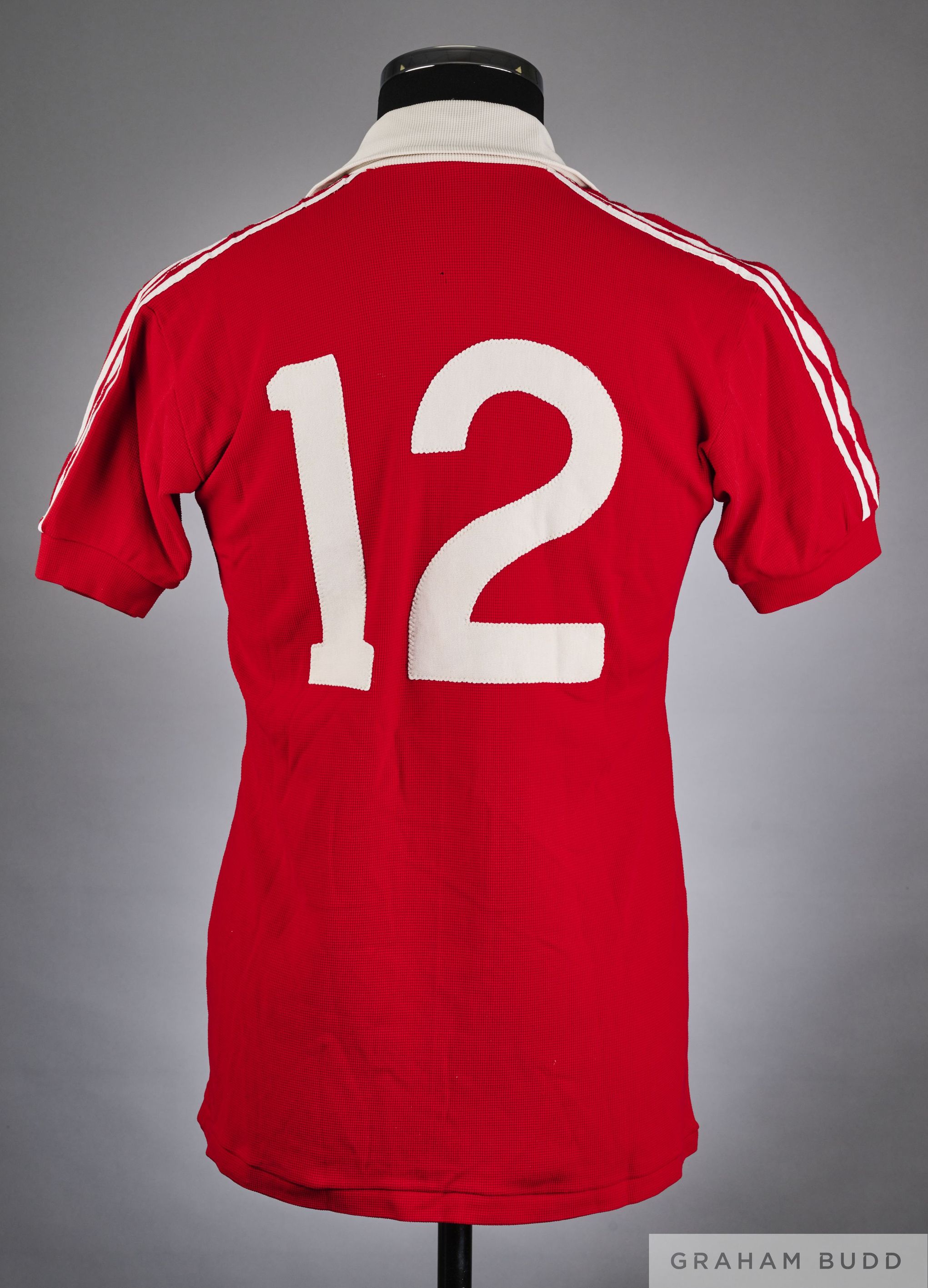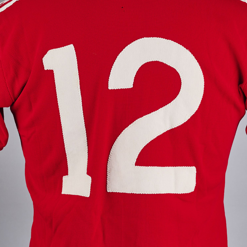 Also featuring a winged-cum-V hybrid collar - in white to contrast with the red base - the 45-year-old article with a number 12 on the reverse surely represents a bargain purchase.