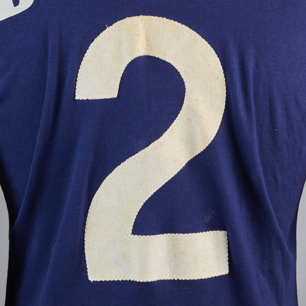 With pioneering lettering on the back of the number 2 shirt, in italicised Cooper Black no less, the item is both anachronistic and evidently contemporary, and the latter is added to with the inclusion of Umbro’s trademark shoulder-and-sleeve taping and the contrasting winged collar.